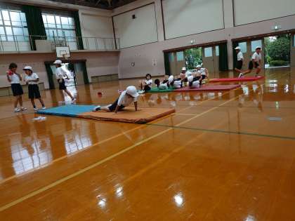 4年生の体育では,晴天時はハードル走,雨天時はマット運動を進めています。