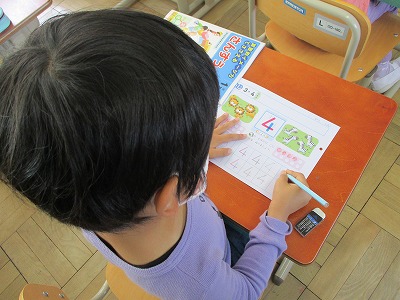 1年生はひらがなや数字の練習をしています。この時間は「4」の練習をしていました。