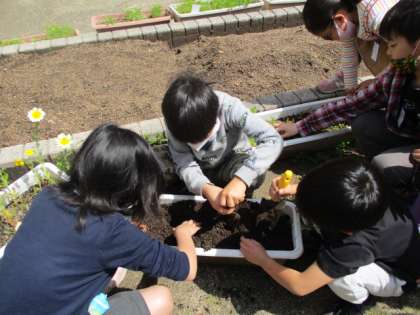 理科の学習でいろんな植物の「たね」をまきました。これからどのようにして成長していくのかしっかり観察していきたいと思います。