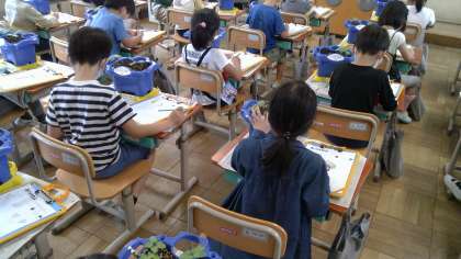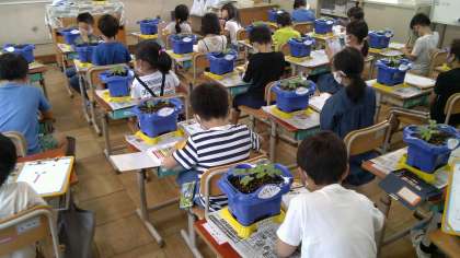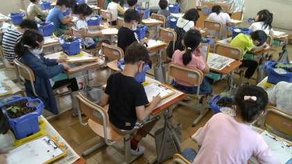 あさがおの芽を観察しました。子どもたちは,「くきの色が赤紫色だ」「葉っぱに毛がはえている」「葉っぱにもようがある」等見たり,触ったりして気付いたことを観察カードに書いていました。花が咲くのが楽しみです。