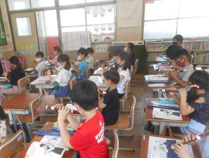 今日の音楽の時間では,リコーダーの使い方について学習しました。初めてのリコーダーに子どもたちは興味津々!