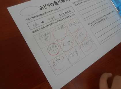 今回注目するのは緑の食べ物!体の調子を整えるビタミンや食物繊維を多く含む野菜を,たくさん挙げることができました。