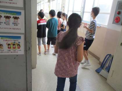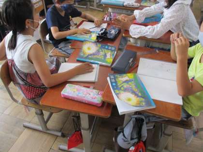 国語の学習で学校や地域にあるユニバーサルデザインについて調べていきます。そこで校内を回り,学校の中にある工夫について調べ,そのあとグループで地域にある工夫について話し合いました。