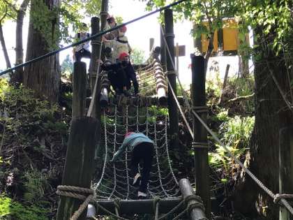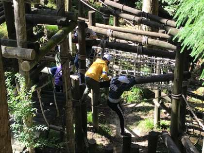 好天のもと,子どもたちは「冒険の森」で力いっぱいアスレチックを楽しみました。難しいコースにも,グループで声をかけ合いチャレンジしていました。子どもたちは全員元気です。
