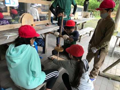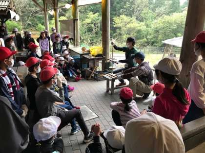 火のおこし方の説明を聞いたあと,グループで協力して火だねを作りました。その後の野外炊事のためにも,早く火がつくように頑張りました。