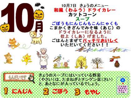 和風ドライカレーはピリッとしたカレーの風味と,ごぼうの香りが際立つ献立です。