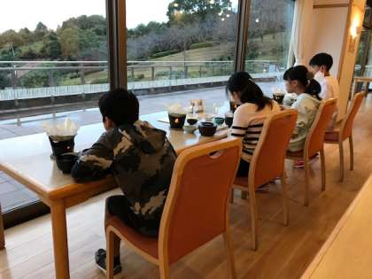 朝食会場からは,きれいな瀬戸内の海を見ることができました。今日は一日よい天気の中で活動できそうです。