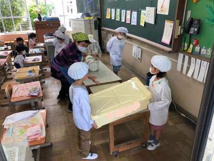 今日は小学校で初めての給食です。みんな上手に配って食べていました。