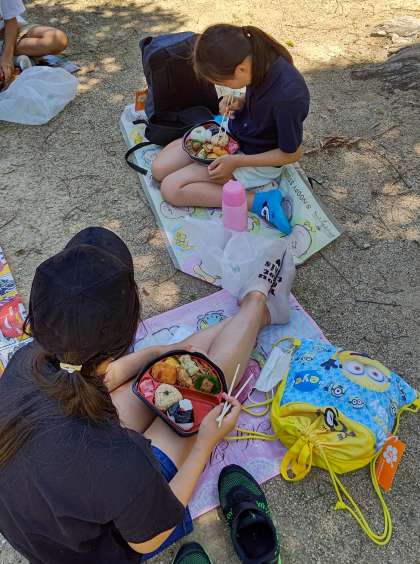 姫路城に到着し、ぼたん園で昼食のお弁当を食べました。このあとは,世界文化遺産の姫路城を見学します。姫路城の壮大さを肌で感じてほしいです。
