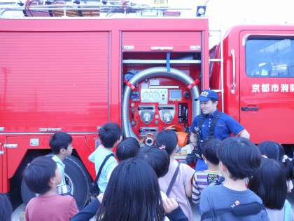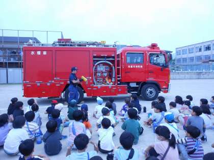 消防車が安井小学校の校庭に来てくれました。1年生みんなで消防車の見学をしました。ホースを実際に触ったり、消防隊員の方のお話を聞いたりしました。身近に大きな車を見て、子どもたちは大喜びしていました。来週からは、消防車の絵を描いていきます。