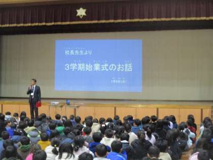 冬休みが明け子どもたちが元気に学校に来てくれて教職員一同うれしく思っています。9日(火)の始業式では、けじめをしっかりとつけて校長先生の話を聞く子どもたちの姿がありました。