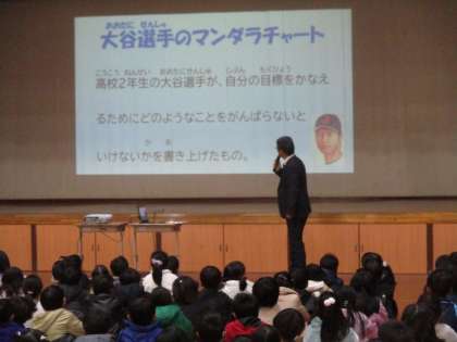 校長先生からは、ドジャースに移籍が決まった大谷選手が、高校生の時に作成した目標シート(まんだらチャート)について紹介がありました。そこには、「あいさつをする」や「落ちているゴミを拾う」等が書かれていて、本校が大切にしている「みそあじ運動」にも共通するところがたくさんありました。当たり前のことを当たり前にしていくことの大切さに子どもたちも改めて気づいていたようです。