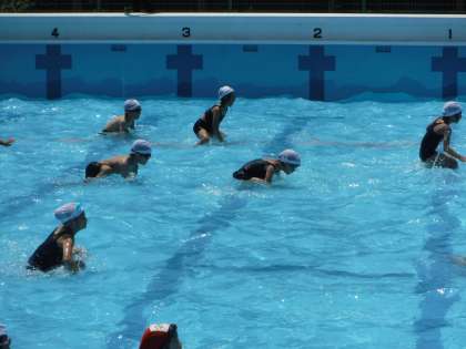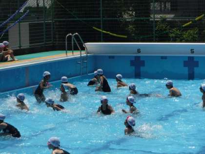昨日に続いて、水慣れをしました。子どもたちは小学校のプールに少し慣れてきたようです。水の中でワニになって歩いたり、ジャンプしたり、顔をつけたりしました。