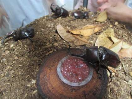 先週あたりから、右京区の森林組合の方々から頂いたカブトムシが、次々とさなぎから成虫になり元気に動いています。