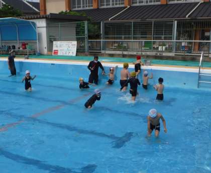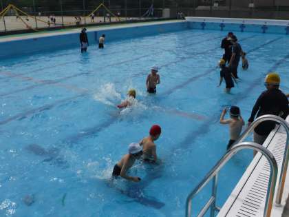 水あそびの学習が始まりました。今日は4組でプールに入りました。プールでの約束を確認した後、水慣れをしました。少しずつ水に慣れ、宝さがし(ご石拾い)をみんなで楽しみました。