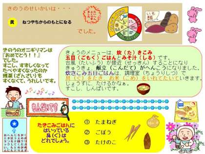 ★ 今日の献立 ★ ・炊きこみ五目ごはん ・みそ汁 ・牛乳