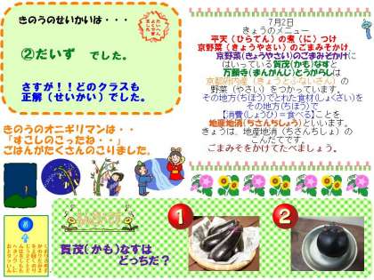 賀茂なすと満願寺とうがらしを使った地産地消の献立です。