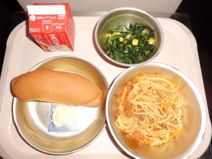 ◆ 今日の献立 ◆  ・小型コッペパン  ・牛乳  ・スパゲティのミートソース煮            ・ほうれん草のソティ  ・チーズ