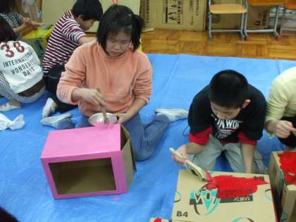 みんなで 大きな段ボールに 色ぬりしたり 紙を切ったりして