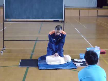 心肺蘇生法や,AEDの扱い方について説明していただいた後,人形を使って実践しました。もしものことがあってはならないのですが,もしもの時にすぐに動くことができるよう,教職員も心構えができました。