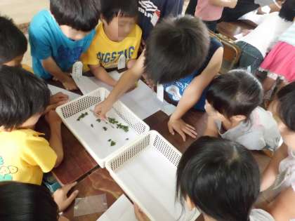 今日は,4年生の先輩たちにカイコの育て方を教わりました。