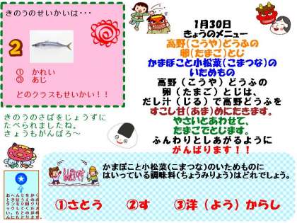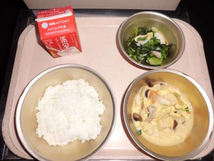 ◆ 今日の献立 ◆ ・ごはん ・牛乳 ・高野どうふの卵とじ ・かまぼこと小松菜のいためもの