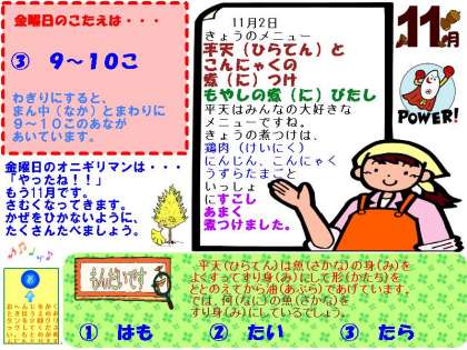 ◆ 今日の献立 ◆ ・麦ごはん ・牛乳 ・平天とこんにゃくの煮つけ ・もやしの煮びたし