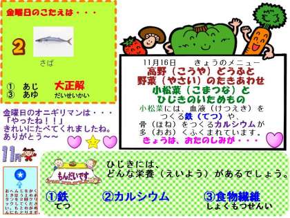 ◆ 今日の献立 ◆ ・麦ごはん ・牛乳 ・高野どうふと野菜のたき合せ ・小松菜とひじきのいためもの