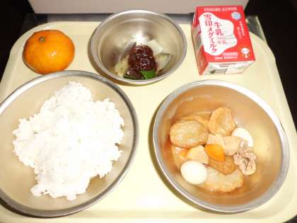 ◆ 今日の献立 ◆ ・ごはん ・牛乳 ・平天の煮つけ ・京野菜のごまみそかけ ・みかん