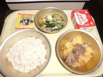 ◆ 今日の献立 ◆ ・麦ごはん ・牛乳 ・肉じゃが ・小松菜と切干大根の煮びたし ・黒大豆