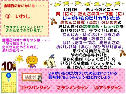 ◆ 今日の献立 ◆ ・肉だんごのスープ煮 ・じゃがいものピリカラいため