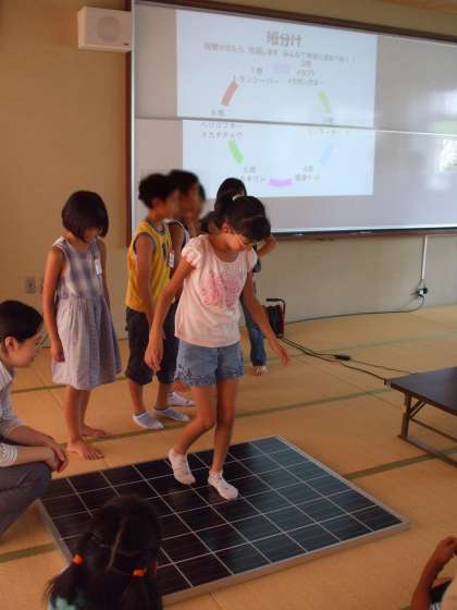ソーラーパネルに実際乗ってみたり,環境にいいことをみんなで考えたりしました。