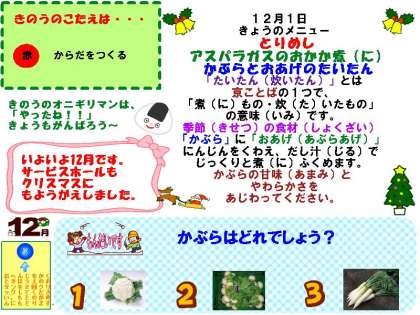 ◆ 今日の献立 ◆ ・麦ごはん ・牛乳 ・とりめし(具) ・アスパラガスのおかか煮 ・かぶらとおあげのたいたん