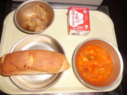 ◆ 今日の献立 ◆ ・チーズコッペパン ・牛乳 ・スパイシーチキン ・ミネストローネ