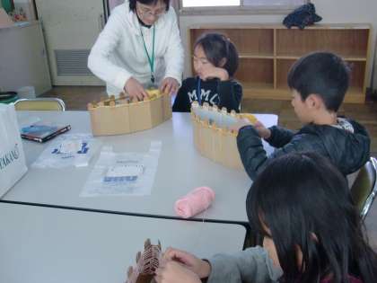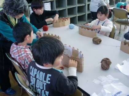 放課後まなび教室で,毛糸と段ボールを使って編み物に挑戦しました。