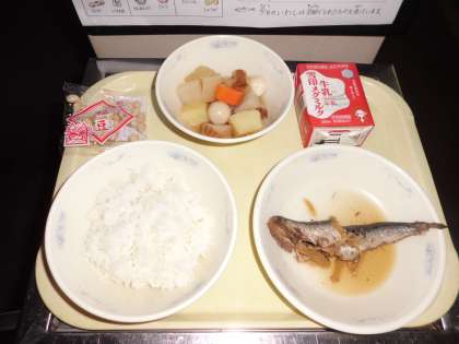 ◆ 今日の献立 ◆ ・ごはん ・牛乳 ・いわしのしょうが煮 ・関東煮 ・いり豆