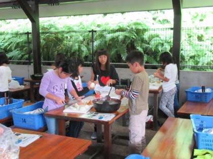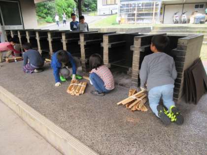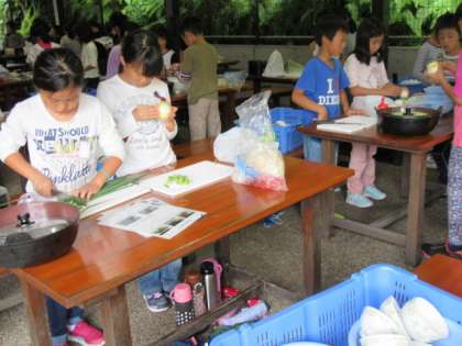 かまど係は、かまどの準備、調理の係は、野菜を切るなど、グループで役割分担をし、それぞれ自分の分担を一生懸命にがんばっています。