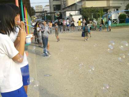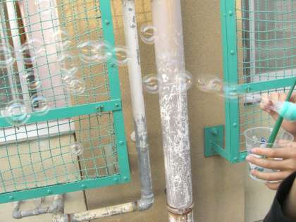 今日はシャボン玉を作る実験です。屋根までとんだかな?