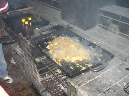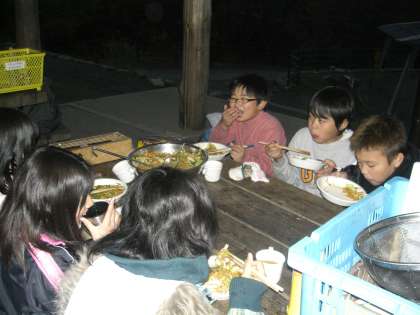 「作らざる者食うべからず」といったごとく,野外炊事の多い,サバイバルな山の家での活動が続いています。今日の晩御飯はヤキソバです。簡単そうですが,具材を切った後に,野菜を炒めたのですが,ニンジンとタマネギが意外と火が通りにくく,いくつかの班では,十分に火が通っていないかったみたいです。でも,肉とイカをいれ,ソースで味付けをして完成です。「から〜い」と言っている班や,「おいしい」と言っている班などいろいろでした。食べ終わったあとの後片付けがまた一苦労です。「来たときよりも美しく」をモットーにがんばっています。でも,さすがに野外炊事場も日が暮れると寒さが身にしみます。