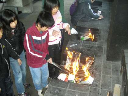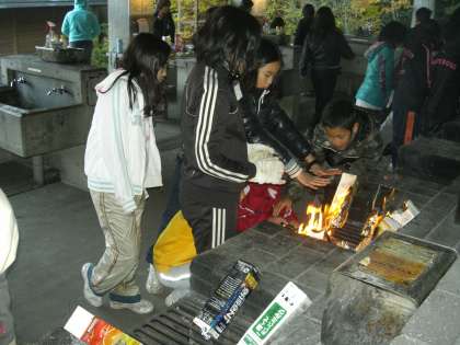 三日目の朝。西院小学校だけでの朝のつどいを第一炊飯場で行いました。続きで朝ごはんづくりです。2回目となるパックドックづくりなので,大変手際よく作っていました。