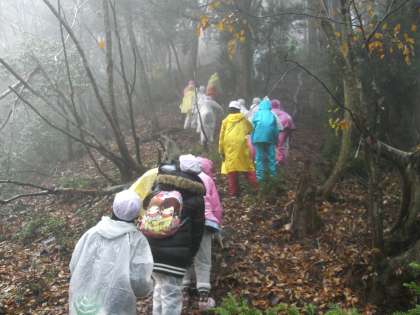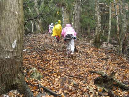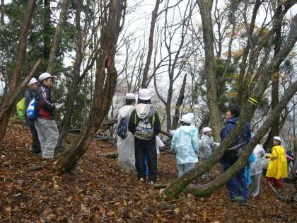 尾根づたいなので,狭いところでは,両側が斜面になっているようなところを歩きます。雨も降り続く中,子どもたちは1時間あまりがんばりました。そして,高台になっているところに到着すると,一瞬霧が晴れ,青空がのぞき,周囲の景色を見ることができました。
