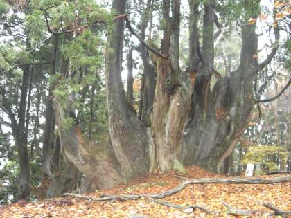 高台から今度は尾根づたいにしばらく下ったところに,お目当ての「伏状大杉」がありました。圧倒的な存在感のある,推定樹齢1400年の大杉です。子どもたちは,大杉の前で記念撮影をしました。北風が冷たく,すぐに下山することにしました。