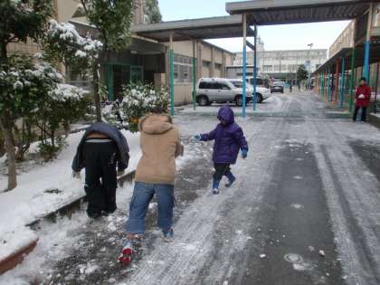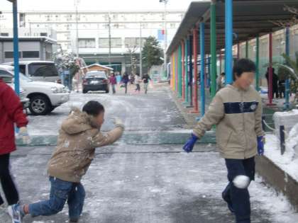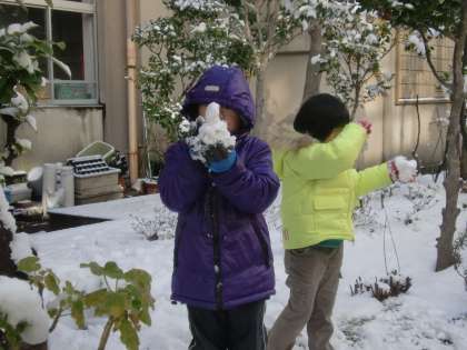 昨日からの雪が残っている寒い朝ですが,雪を見たらじっとしていられない子どもたちは,早速外へ飛び出していきました。「まてえ〜!」「きゃあ〜!」と追いかけっこをしたり,「えいっ!」と投げた雪玉が当たって「つめた〜い!」と叫んだり,「ほら,雪だるまだよ!」と見せてくれたり,真っ白な雪をいっぱいつかんで遊んでいました。時には,顔に当たったり,首の中に入ったりしたけれど,ちっとも寒くない! だって,楽しくって! だれだ? 先生に当てたのは? お返しするよ,覚悟!!