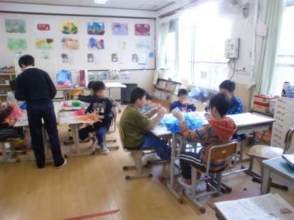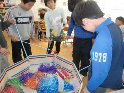 毎年小さな巨匠展では,山ノ内・安井・西院の3校で合同作品を作っています。今年は,宝さがしをします。一人ひとりが宝物を作り,海の中から探す楽しいものです。海の中にこんなものがあるといいな,と思うものや,カラフルなヒトデなどを作って,その中に自分の宝物を隠し,マグネットのついたさおで探していくのです。何だかわくわくしてくるでしょう? 1月27日から30日まで,京都市美術館別館に展示しています。是非,来てくださ〜い。