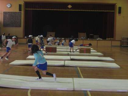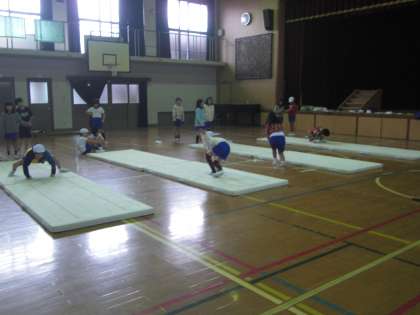 マットあそび頑張っています!!3年生のマットでは「前転」「後転」「開脚前転」「開脚後転」「側転」「とび前転」に取り組んでいます。たくさんの子どもたちが苦戦しているのが「側転」です。手手足足なかなか順番にマットにつけなかったり,足がピーンとのびなかったり苦戦中です。とび箱でかわとびをして足を伸ばす練習をしたり,壁倒立をしたり,奮闘中です!!