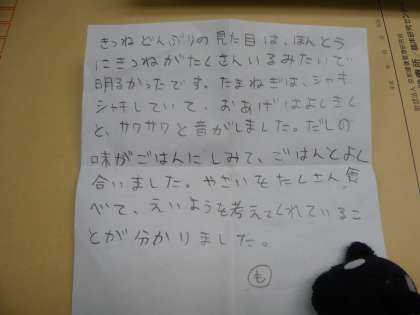 (見た目は,本当にきつねがたくさんいるみたいで明るかったです。たまねぎは,シャキシャキしていて,おあげは,よく聞くとサワサワと音がしました。だしの味がごはんにしみて,ごはんとよく合いました。野菜をたくさん食べて,栄養を考えてくれていることがわかりました。)