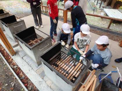 うまく火がつきますようにと願いをこめて,かまどで火おこしの準備です。