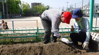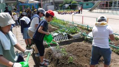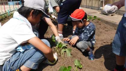 コーンとツルレイシの種まきを一人一つずつ,サツマイモとししとうの苗をペアで協力して植えました。
