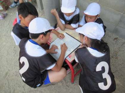 各チームで,走順やバトンパスの工夫を話し合い,タイムの向上を目指しています。