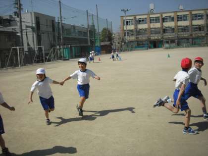 2人組で手をつなぎ,追いかけたり逃げたりする手つなぎおに。